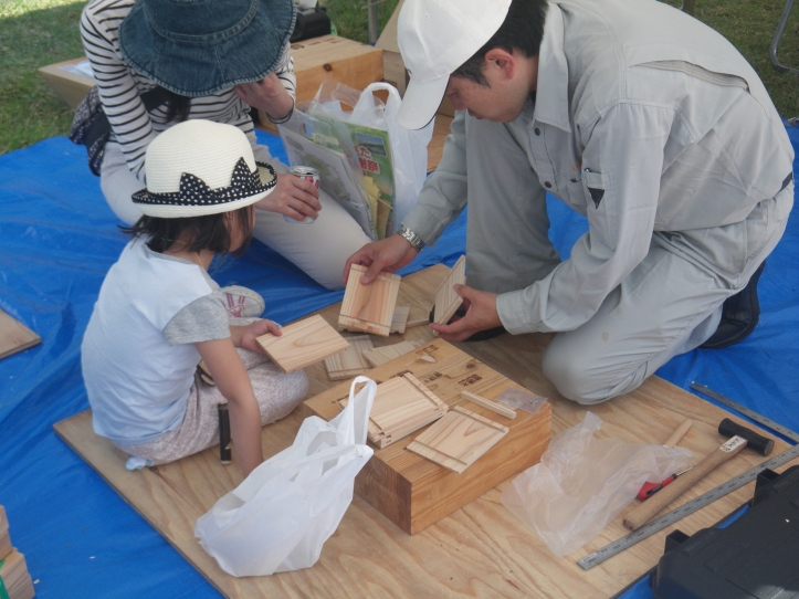 写真は、子供たちが「地材地住」木工教室で貯金箱を製作しているところです。