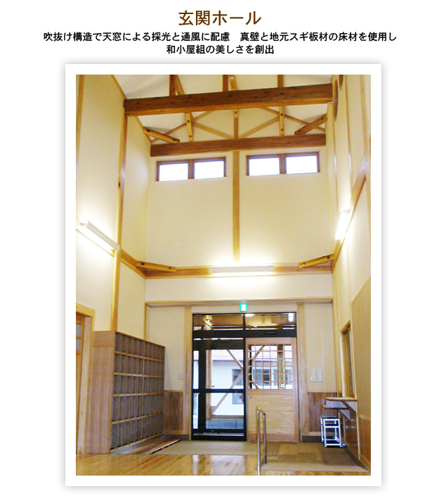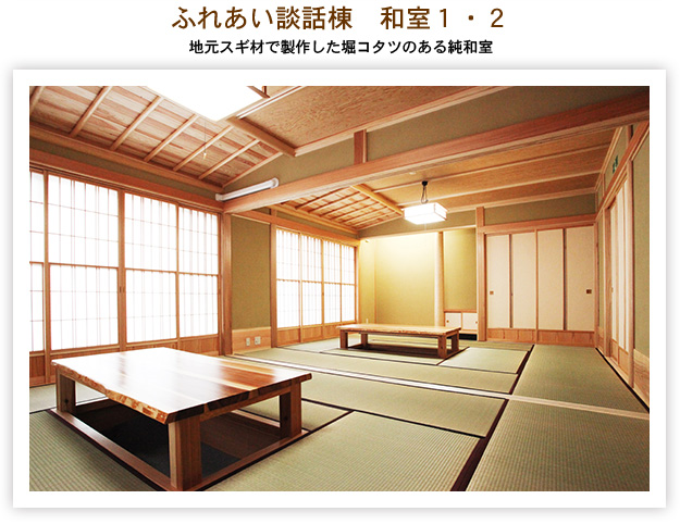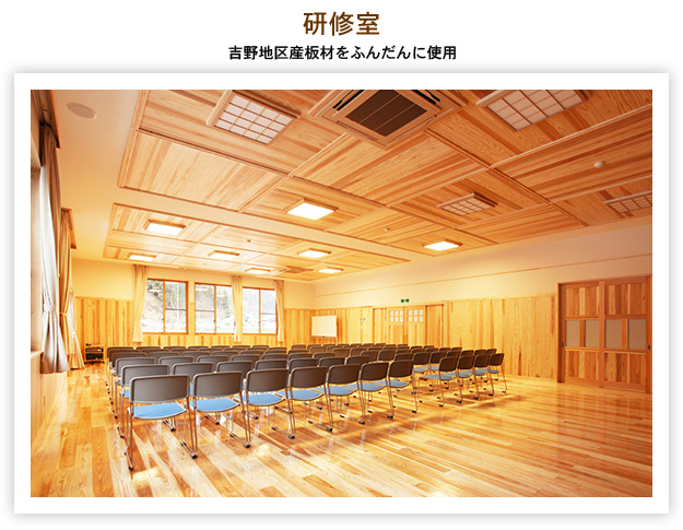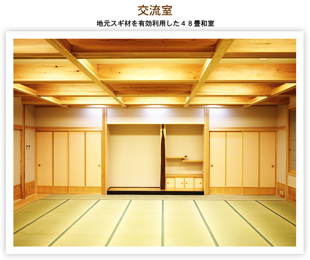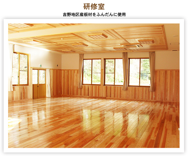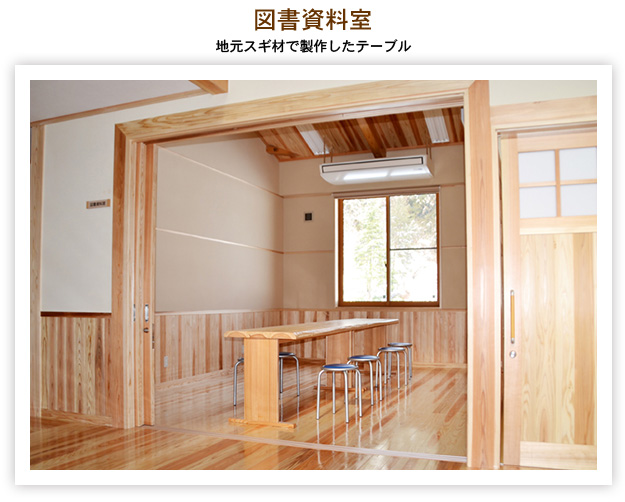 全建築木材使用量の84%が地元南陽市吉野地区のスギを使用し、木材のもつ健康で温もりのある快適な生活空間の形成を通じ、木と触れ合い、木の良さを実感する機会を提供するとともに、一般住宅等への地域材の利用促進を図り、併せて地域住民の交流拠点として新設されました。